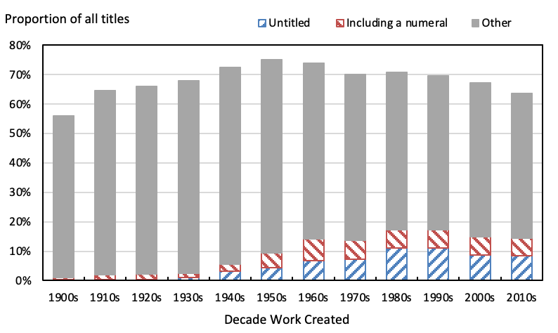 A consolidated measure of these trends is that of the prevalence of short titles of three words or fewer in length, which I have also split into short titles including ‘untitled’, short titles including a numeral and not including ‘untitled’, and other type of short title.7 These trends are shown in Figure 9 and, as can be seen, minimal titling has always been a major component of titling practice. The proportion of all titles of length three words or fewer rose persistently and markedly from 56% with works created in the 1900s to 75% in the 1950s before falling back to 64% in the 2010s. Within that overall trend, short titles including ‘untitled’ peaked at 12% of all titles of works created in the 1980s, and has declined since then to 9% of all titles in the 2010s. Short titles including a numeral but not ‘untitled’ peaked in the 1960s at 7% of all titles of works created in that decade. Other types of short title rose to 67% of all titles in the 1940s, before declining to represent 49% of the titles of works created in the 2010s.