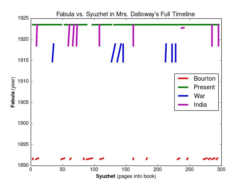 These few lines are packed with TOs. First, Woolf describes a luncheon during the summer at Bourton. This TO is absolute with regard to the full scale of the novel’s fabula, fixing the event within that summer. Yet we are also given a relative TO for the luncheon: it must have happened near the end of the summer, because Sally and Clarissa part ways afterward. In my initial readings, I flagged this TO for inclusion, but I eventually realized that attempting to map the contours of that summer would be futile because Woolf provides so few other TOs for situating NCs within this period. But because the fabula spans decades, it’s fairly inconsequential for a time map when an event occurred within those few months. Furthermore, the memory of this specific luncheon initiates several pages worth of remembrances from throughout the summer. As such, I chunked these NCs into a single one spanning the whole summer and omitted the aforementioned TO from my data. I have likewise omitted the TO which iteratively references a handful of meetings that occurred over the span of ten years. These might be included as a single summarizing NC which lasts ten years, or as six-ish elliptically stacked NCs which span the decade. But these events are not well-positioned within the decade and Woolf never describes them in any detail, so I decided that they’re below the threshold of inclusion. Conversely, I did include this isolated reference to Peter’s time to India because his travels are discussed throughout the novel. This passage contains an unusually high density of TOs, but graphing a novel means iterating this type of thought process across several hundred pages worth of text.