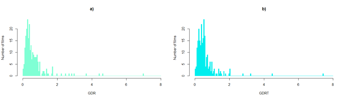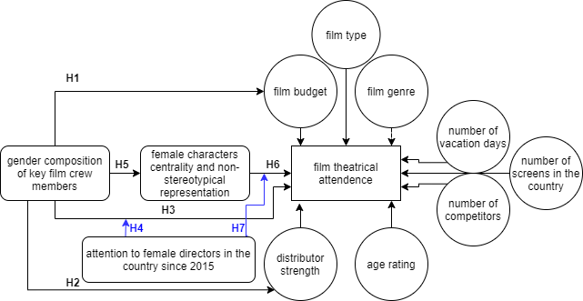 Some factors related to cinema attendance and recommended by previous research were not introduced into the models due to their unavailability or irrelevance to the Russian cinema market. Only the binary gender of film crew members and on-screen characters is considered; the attribution of gender is based only on names and does not represent the self-identification of the crew. Similarly, while the terms “sex” and “gender” are used interchangeably in this paper the authors do not presume that women or men are biologically defined. The theatrical distribution data used has several shortcomings, but it is the only available dataset on the CIS market, and it is widely recognized as a reliable proxy for decision-making by commercial companies and public bodies.