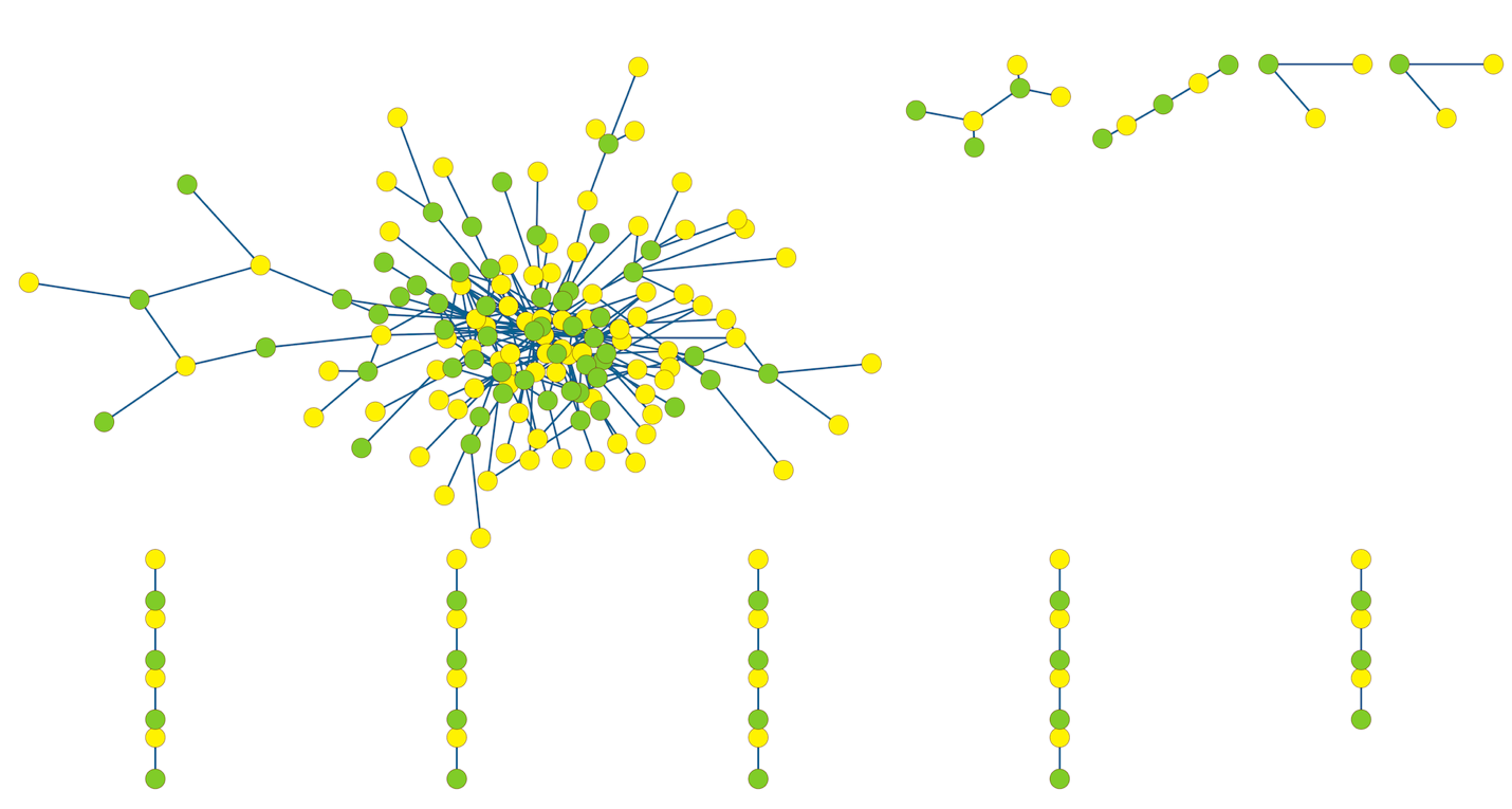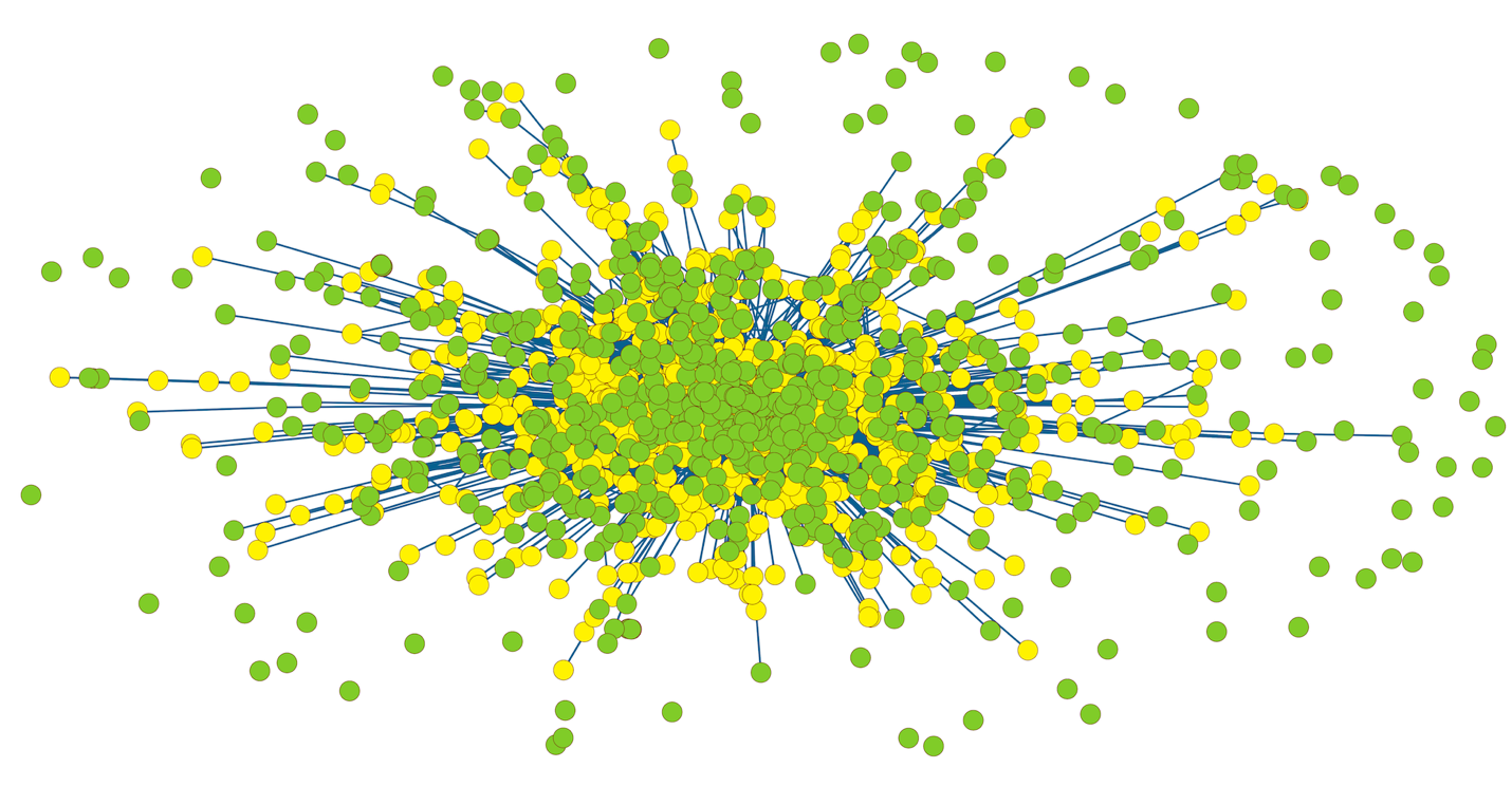 To visualize this network, I apply a force-directed algorithms, Fruchterman-Reingold, to generate a representation in three dimensions, presented in two-dimensional projection in Figure 1. (The layout can also be viewed in 3D using the video link provided in the caption.) Poet nodes are yellow; composer nodes are green; collaboration links are blue.)