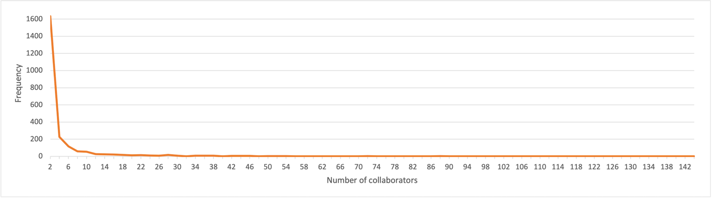 One aspect of the collaboration network is typical of other networks (e.g. friendship) in large-scale urban environments: the scale-free distribution. Plotting any of degree (collaborators), weighted degree (collaborations), or link weights (strength of collaboration) as a histogram, we observe the “long tail” distribution. This distribution is typical of networks that form through so-called “preferential attachment”: nodes with many neighbors tend to be preferred, and attract even more neighbors, because they are better connected; thus, “the rich get richer”. This sort of distribution is called “scale free” because it contains no characteristic “scale”; mean and median do not represent a typical point on the distribution, unlike a normal (bell) curve, or the distribution of human height, for example. Scale-free distributions recur in many domains, from the distribution of wealth to the number of incoming links on websites.9