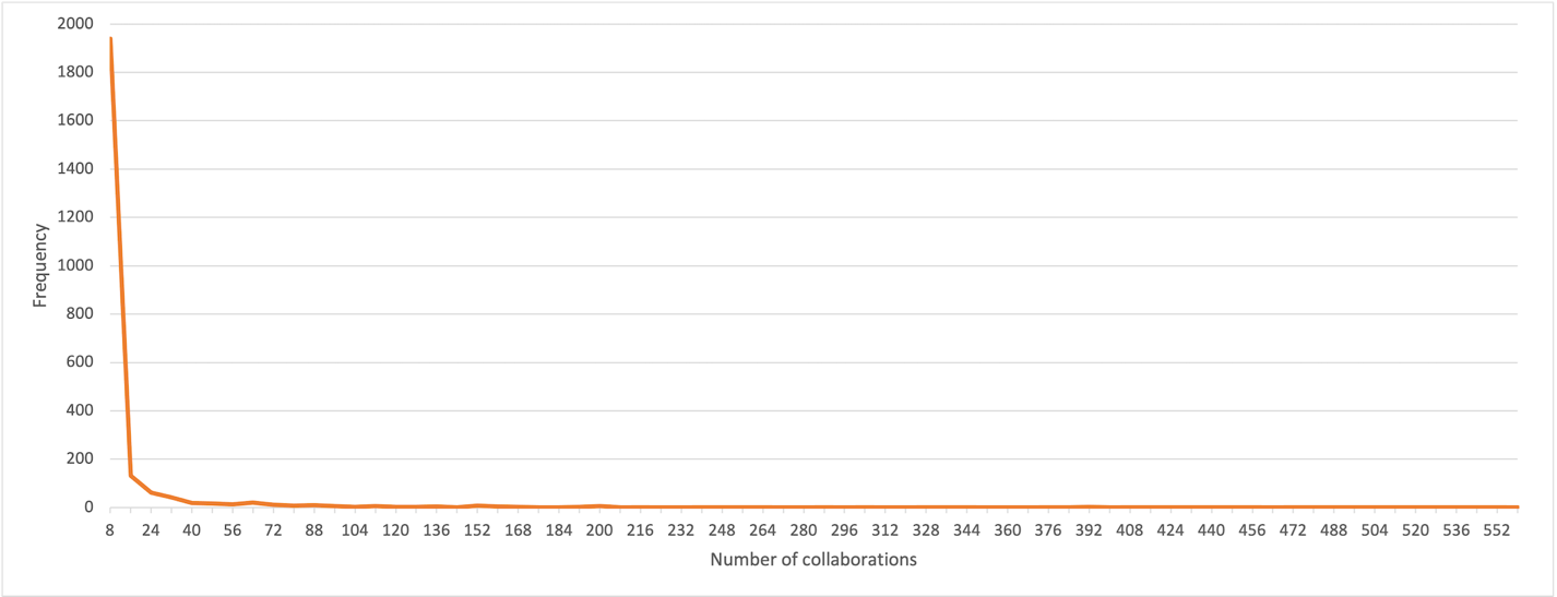 At the onset of any career, an artist has zero collaborations, though they may enjoy other network connections depending on the social environment into which they are born, including artist family members and friends. Some artists may be “better”, in the sense of musical talent and quality, resourcefulness, versatility, dedication, or social appeal; others may simply be lucky. But once an artist attracts a critical mass of collaborators, they tend to accumulate more, perhaps roughly proportional to the number they already have, and the degree of these select individuals increases. By contrast, most artists collaborate with far fewer and mostly just one other person. (See Figures 2-4.)
