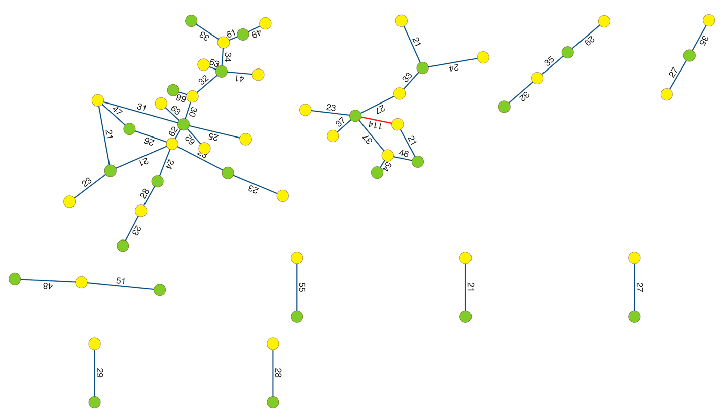 We can search for instances of such a structure throughout the larger network, counting the number of Figure 8-type cliques in which each network node is a member, in order to highlight cohesive subgroups. Searching detects three instances; the result is shown in Figure 9, where red nodes are members of all three cliques, green nodes are members of two, and yellow nodes are members of just one (nodes that are not members of any bipartite clique are removed). Energizing (using Kamada Kawai), the red nodes move to the center, and yellow nodes to the periphery. The analysis highlights the centrality of poet Abdel Fattah Mustafa and composer Mohamed El Mougy, who together link the two halves of this tightly connected web