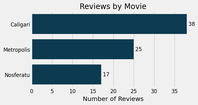 We thus dedicated ourselves to a manual collection of reviews, eventually establishing a corpus of 80 reviews distributed as follows: 38 (47%) reviews for Caligari, 25 (31%) for Metropolis, and 17 (21%) for Nosferatu (Figure 1). While the majority of these (56%) were still obtained through the MHDL, other sources also proved important (Figure 2). A little-known website by the independent scholar Olaf Brill called filmhistoriker.de proved particularly helpful (contributing 32% of reviews) due to its provision of clean digital text of German-language Weimar-era film reviews split by movie. The third largest source of reviews were books, which reprinted historical reviews in full (Minden and Bachmann; Kaes et al.). Furthermore, our quest to broaden our collection of non-English language reviews led us to explore alternative sources, such as from our fourth online resource, filmportal.de (4%), maintained by the Deutsches Filminstitut & Filmmuseum (DFF). Unfortunately, filmportal holds very few reviews per film, and often only as an image with no OCR at all. While we applied OCR ourselves to those materials using the open-source software Tesseract, this was often futile when it came to poorly scanned and maintained sources, particularly those written in the German gothic script known as Fraktur.