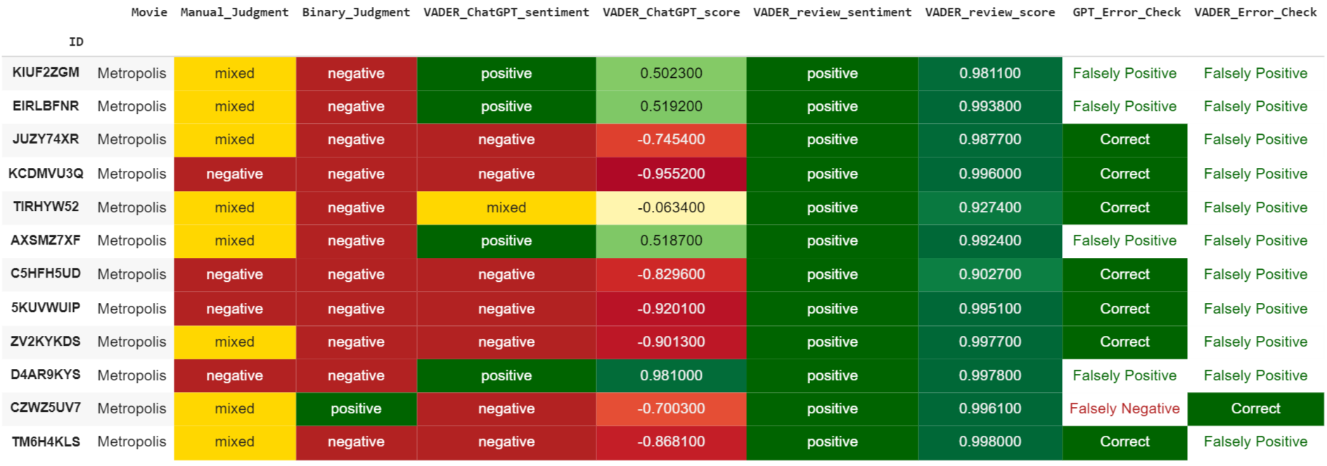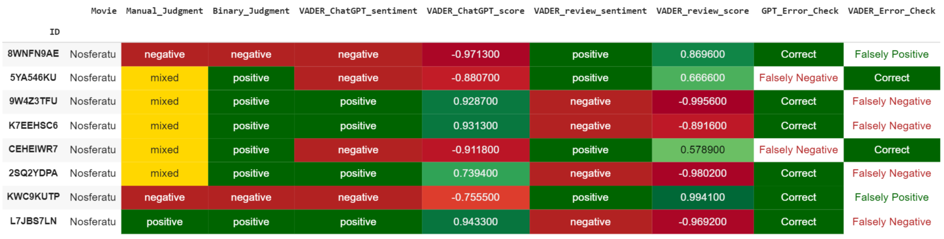 In contrast to the errors in Metropolis, most misidentifications (6 out of 8) in the reviews of Nosferatu erred on the negative side. Admittedly, even those reviews often carried significantly negative comments (which is why so many of them had initially been labeled as mixed). Upon closer examination of the two outcomes marked as incorrect negatives in the VADER-ChatGPT sentiment analysis, the intricacies of each case become evident. This complexity is also intertwined with the intended readership of each review.