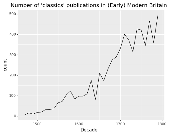 This growth, however, largely results from the growth of book printing in England. When normalized against the total number of ESTC publications per decade, the proportion of Classics publications actually decreases from the 16th to the 18th century, as visible in Figure 2.
