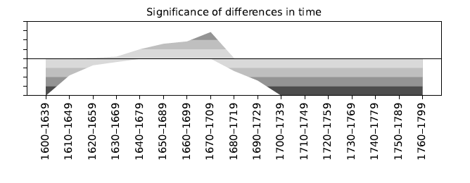 The peak around 1670 is neatly visible also in this case. In order to test whether the second part of the 17th century is significantly “more diverse” than in the following period, we proceed with further verification, by using a permutation test.