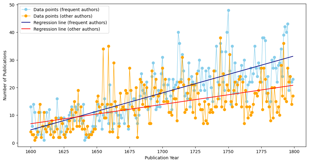 These different metrics naturally lead to the conclusion of a reduction of the diversity of authors. To further investigate this hypothesis, we focus on the list of 20 most frequent authors in the total dataset16. Taken together, they are published in 3905 records, whereas the remaining authors (290) are published in 3244 records. Both sets of editions increase linearly over time, but as is shown in Figure 7, the rate of change is higher for the frequent authors than for the others17.