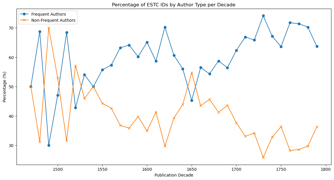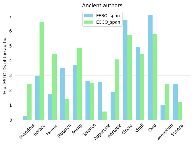 EEBO and ECCO have been linked to the harmonized ESTC, and the metadata of the three datasets enriched (Lahti et al.). To identify classical works in the English Short Title Catalogue (ESTC), we followed a two-fold approach. First, we exploited biographical information available in the ESTC “actors” database (Tolonen et al., “Examining the Early Modern Canon”). We looked for authors writing in Latin and Greek of which either the date of birth or death was prior to the 6th century AD (as a conventional end date for Late Antiquity). The resulting list, manually checked, contains 294 authors. A second approach relied on existing authority lists for the classical world. Trismegistos Authors (TM Authors)6 provides a comprehensive gazetteer of ancient world authors (800 BC – AD 800), at the time of writing 7374 entries (October 2023). It is based on authority files and metadata such as the Leuven Database of Ancient Books, PHI Latin, TLG, Pinakes, Wikidata, Perseus Catalog, etc. Of these collected authors, 3326 are dated to a period before the 6th century AD. We matched the VIAF IDs, present in both ESTC authors’ database and TM Authors, but the number of authors retrieved in this way (only 258) was unexpectedly lower than the number obtained using the previous approach. An examination revealed that 45 authors appeared only in the “Trismegistos list”, and 80 only in the list based on ESTC biographical information. The differences between the two were mostly explained by i) the presence of multiple VIAF IDs for the same individual7; ii) the lack of a VIAF identifier in either ESTC or Trismegistos; iii) the omission of an author in TM Authors, which is often due to differing interpretations of the concept of authorship (e.g., Jesus Christ is considered an author in ESTC but not in Trismegistos8). The two lists were manually checked and subsequently merged, providing a total of 312 classical authors attested in ESTC9.