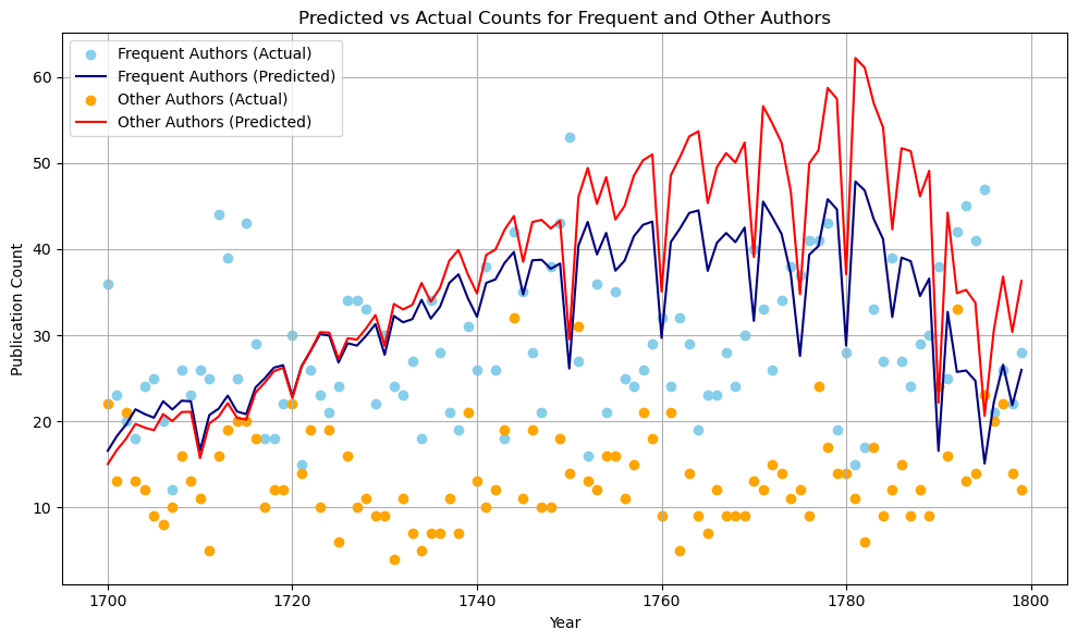 When used for predicting 18th century evolution, the two models visibly behave differently. The most popular authors in the eighteenth century had their works printed about as much as we would expect based on the seventeenth century. However, for the other, less well-known authors, it is a different story. Their works were printed much less than we would have predicted based on the seventeenth century. There clearly has been a shift over time, and the most popular authors are taking up more and more space in the world of classical literature, while the lesser-known authors are getting less attention. Two metrics confirm this difference: Mean Absolute Error (MAE), which is the average absolute difference between what we expected and what actually happened, and Root Mean Squared Error (RMSE), which tells us how much the predicted values differ from the actual values. For the popular authors, the MAE and RMSE are smaller than for less-known authors (10.2 and 12.9, vs 23.9 and 27.5)20. Our 18th century predictions based on the seventeenth century are closer to reality for well-known authors, and further off for less-known ones. The less-known authors are clearly not getting as much attention in the eighteenth century compared to what we might have thought based on the previous century.