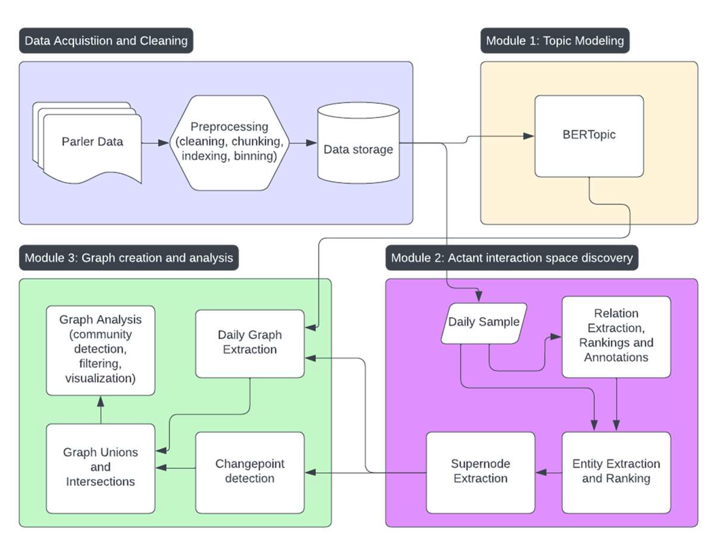 Although the conversations on Parler might simply have been “venting” (Rösner and Krämer), the subsequent violent actions of insurrectionists and their clear engagement with the platform suggest that their discussions carried with them the emerging formulation of a threat narrative that supported subsequent real-world actions (Munn). In threat narratives, an inside group perceives itself as confronted with a threat (or series of threats), often existential in scale, requiring a strategy for fighting back (Chavez; Loveland and Popescu; Wolfendale; Ciovacco). Stories such as anecdotes and personal experience stories, as well as partial stories, observations and commentary on those stories offer an opportunity to explore a range of strategies for dealing with a particular threat and, as the stories circulate across social networks of close, ideologically homogeneous groups, a consensus forms concerning the appropriate strategy—and a hoped-for outcome—for dealing with these threats (Tangherlini, “Who Ya Gonna Call?”; Tangherlini, “Toward a Generative Model”; Swidler). Computationally, the discussions can be modeled as a narrative framework graph, consisting of actants (nodes) and their relationships (edges). During storytelling, network paths are activated, new actants added, relationships emphasized, sides ascribed or inferred, and threats, strategies and possible outcomes solidified (Holur, Wang, et al.; Holur, Chong, et al.). Consequently, the underlying narrative framework encodes the cultural ideology of the group engaged in this process, guiding belief and, in some cases, real world action. In our following study of Parler, we develop a computational pipeline incorporating natural language processing, large language models and network analysis to uncover this underlying narrative framework (Bearman and Stovel; Sadler, “Narrative and Interpretation”; Tangherlini, Shahsavari, et al.; Sadler, Fragmented Narrative). This approach allows us to identify the discursive contours of an emergent conspiracy to counteract the perceived threats of the underlying conspiracy theory that motivates many posts to the site.