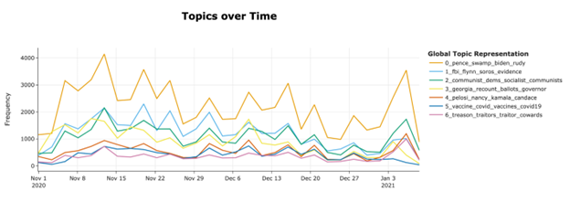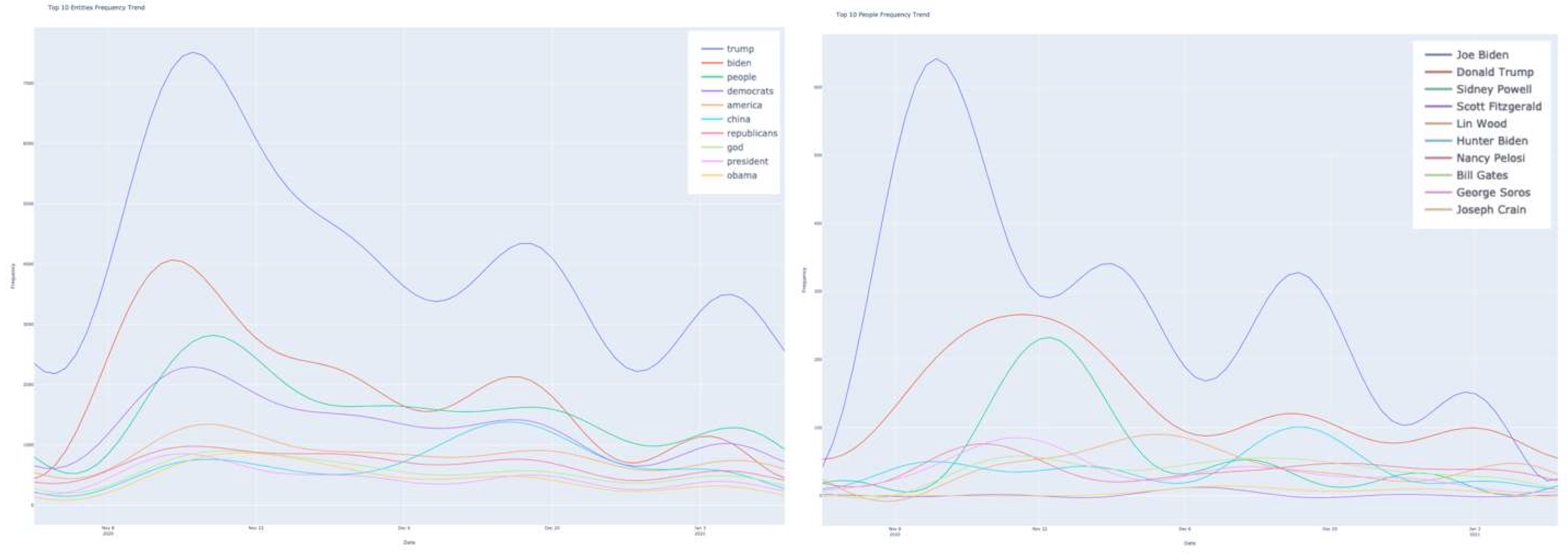 Although these entities are persistently present in the discussions, their relative importance shifts over time as new ideas are introduced into the conversations. Yet, the stability of the entities in the rankings lends support to the notion that the conversations on Parler were focused and consistent in their support of Trump from the start and the underlying consensus that the election was manipulated by multiple nefarious actors was a common point of departure.