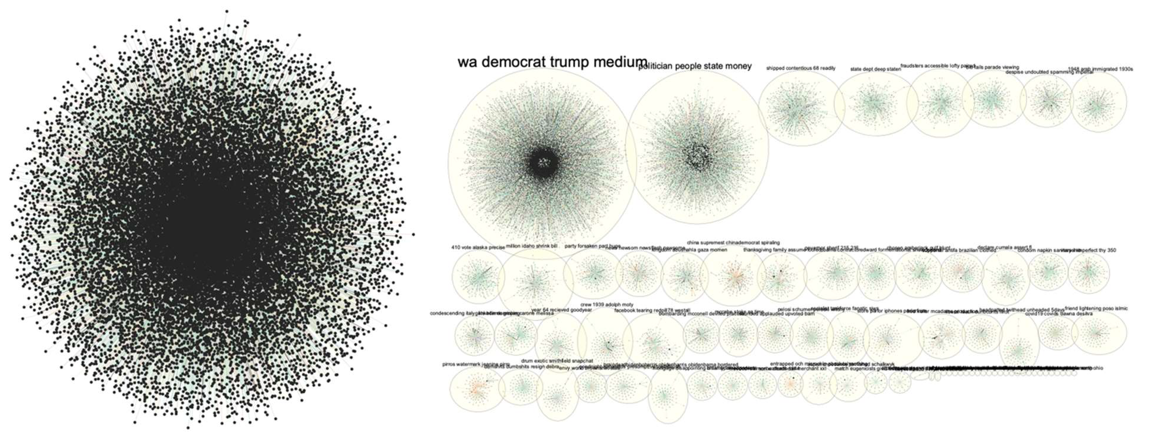 Ivy league professors and other left wing actants are connected through edges with the topics “communists” (2) and “Pelosi” (4) to treasonous politicians in the “Hunter agenda soul Obama” cluster, while the Antichrist cluster is linked through “swamp” (0) and “Communist” (2) edges to Dominion and ballot stealing in the main Sydney Powell cluster. In contrast, the “Helping patriot police” cluster, with a prominent “Trump martial law” node is connected by edges in the “Barr” topic (22) to supportive nodes such as “Republicans” in the “democrat mass communist” cluster and Kyle Rittenhouse in the “socialist online harmful” cluster. This pattern of specific topic edges between subgraphs repeats itself across all our decompositions and lends support to the hypothesis that these narrative subgraphs are connected through edges, largely encoding verb phrases, that are dependent on ideologically motivated interpretations of events or other forms of speculation.