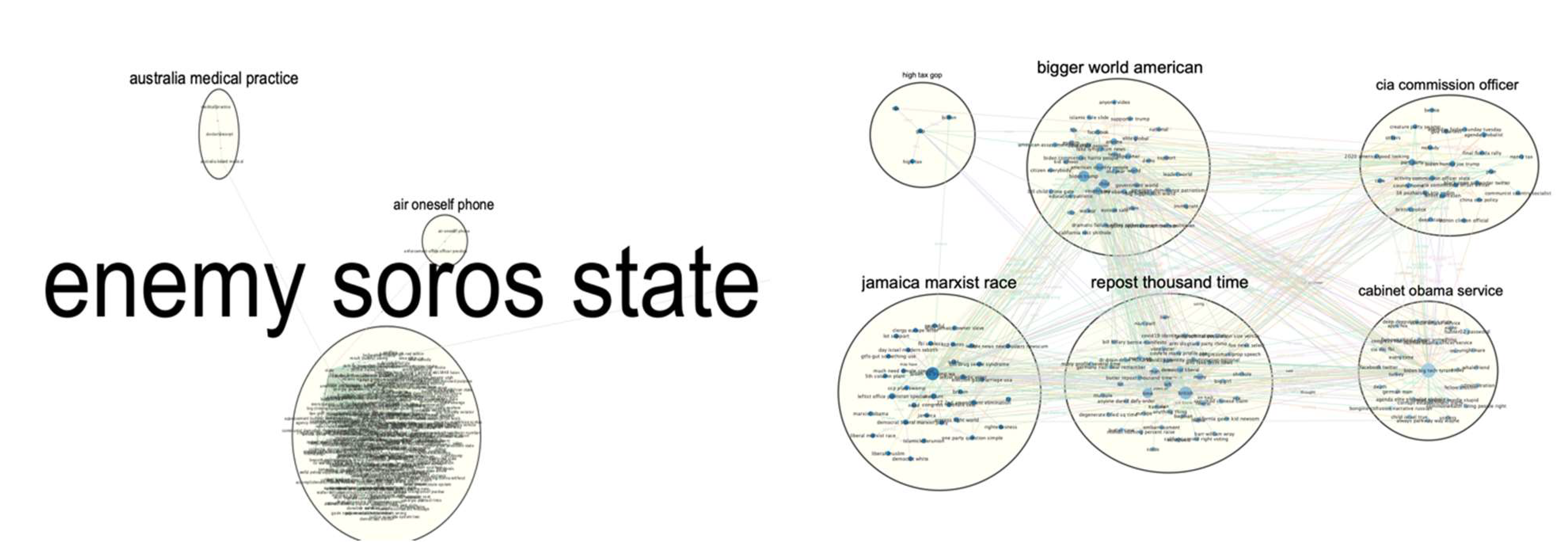 These subgraphs can be further decomposed into additional subgraphs that in turn reveal an increasingly fine-grained view of the components as interlocking narrative communities. For instance, one of the larger narrative clusters in the union graph details the role of George Soros and other globalists with their connections to deep state actors such as the CIA and Obama holdovers and their alliance with Marxists and communists, thereby emphasizing their role as enemies of America and her patriotic defenders (Fig 7).