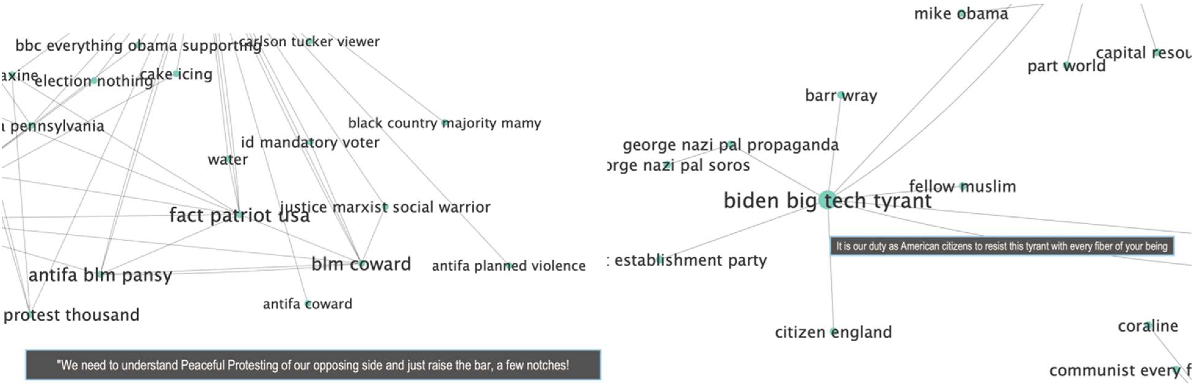 Hiding within the thicket of these conversations starting early in November is the emergent consensus that the best way to challenge the threat to the election posed by the all the different groups marshaled against God, country, patriots and Trump is to plan a protest that matches the perceived violence of Antifa-instigated actions during the BLM protest in the summer of 2020. Exhortations to violent, retributive action and commitments of organizational infrastructure are largely embedded in conversations about BLM and Antifa, and include calls for armed resistance, such as “resist this tyrant [Biden] with every fiber of your being,” while making clear Biden’s close connection to globalists, nazis, big tech, and Islam (Fig 13). Various posts offer aid in organizing, such as “Guys, ten million to Washington is focused on bringing patriot groups together nationwide. If you have a rally or patriot group that needs support…please send us the information…we will help raise awareness”, while posts in the narrative neighborhood of BLM/Antifa endorse violence as a central strategy: “The US Constitution allows for hostile inauguration of a president elect. Will you be first to pick up arms?”