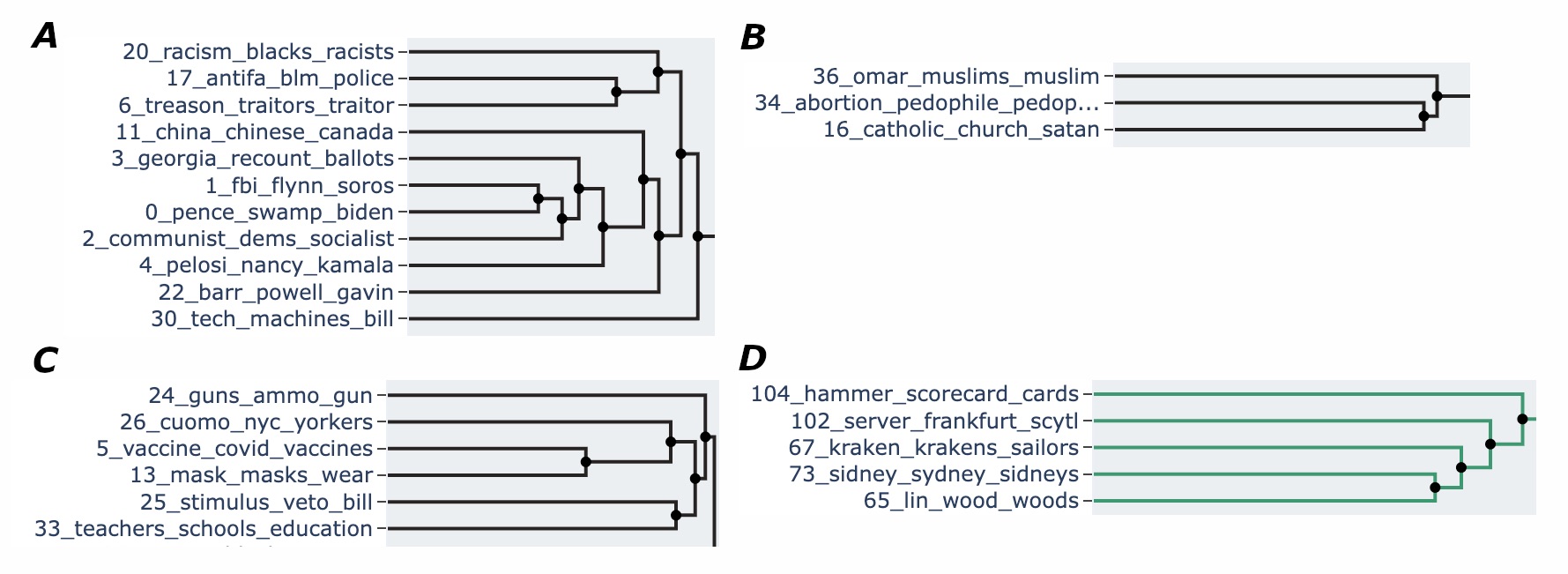 On a large branch of the dendrogram covering forty-five topics including the largest topic groupings, we discover a branch that has an aggregate label of “vaccine, dominion, swamp, pence, pelosi”, an unusually apt summary of the discussions on the platform. At a more granular level, we find specific inflections of these broader topic spaces. For example, there are accusations of treasonous behavior aimed at deep state actors and politicians, revelations that certain religious and political groups are involved in horrific practices such as pedophilia, that the COVID vaccinations and mask mandates were related to state overreach and faulty or fraudulent science, and that globalists and the tech industry pose an ongoing threat to Democracy.