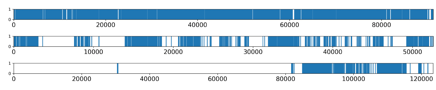 where σc and μc are the standard deviation and mean, respectively, of inter-onset intervals between c’s occurrences. We measure inter-onset interval lengths by the difference between the start token index of one occurrence of a character and the start of their next occurrence. Less bursty characters are more consistently present throughout the book, while bursty ones are fleeting or isolated to a few sections (Figure 2). We theorize that burstiness may be another way in which characters of different racial/ethnic backgrounds may differ in presence within or across books. For instance, we hypothesize that on average, White characters and characters of color may occur with different levels of burstiness within a dataset.