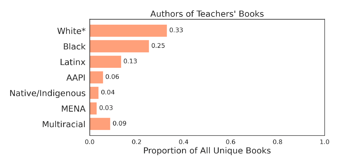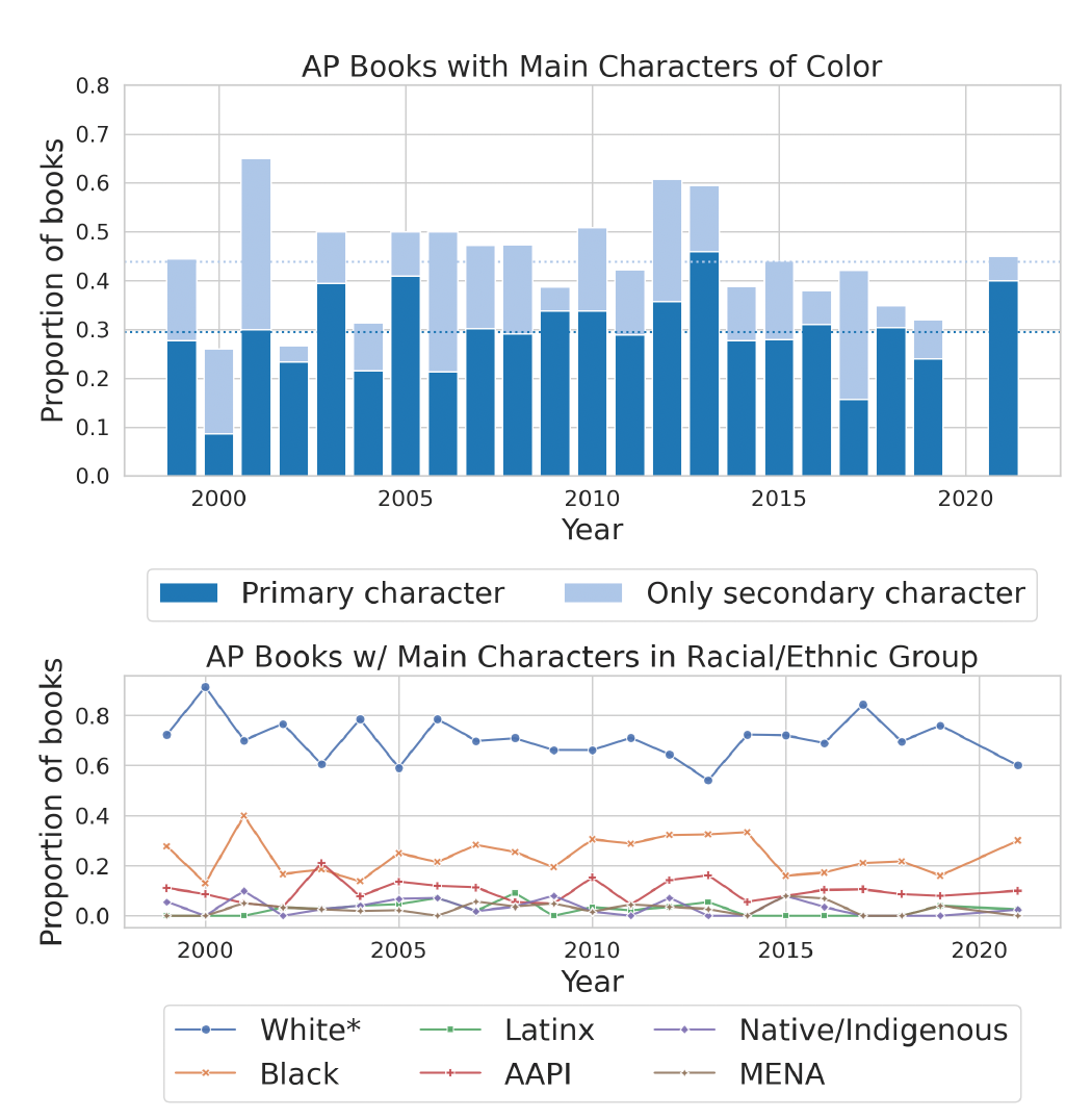 School curricula represent kinds of historical and cultural knowledge that society prioritizes and codifies at certain historical moments. Designed to prepare younger generations for life and career (Tedesco et al. 10), its contents can shape students’ values, beliefs, and identities. In the US, English Language Arts (ELA) teaches literary and writing skills to students, typically through the study of assigned texts. These texts—poetry, plays, articles, and especially novels—are focal points of curriculum, around which educators organize skills and conceptually-based lessons. These texts influence not only students’ understanding of themselves, but also their sociocultural understanding of others (Dee and Penner). In particular, racial/ethnic representations in these literary texts matter for students’ self-affirmation and prejudice reduction (Bishop 3; Banas et al.). In this paper, we quantify the racial/ethnic representation of authors and characters in nearly four hundred books taught in American high schools between 2019 and 2023, to consider what kind of sociocultural knowledge ELA has promoted in the US. If book bans in the US have disproportionately impacted children’s books by authors of color and books that feature characters of color, how does literature teaching in the US approach minoritized racial and ethnic groups (Goncalves et al.)?