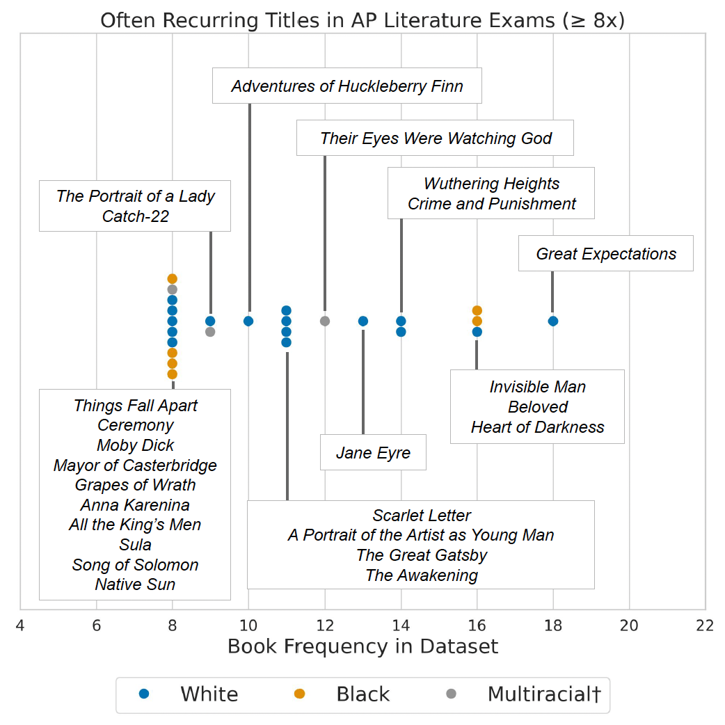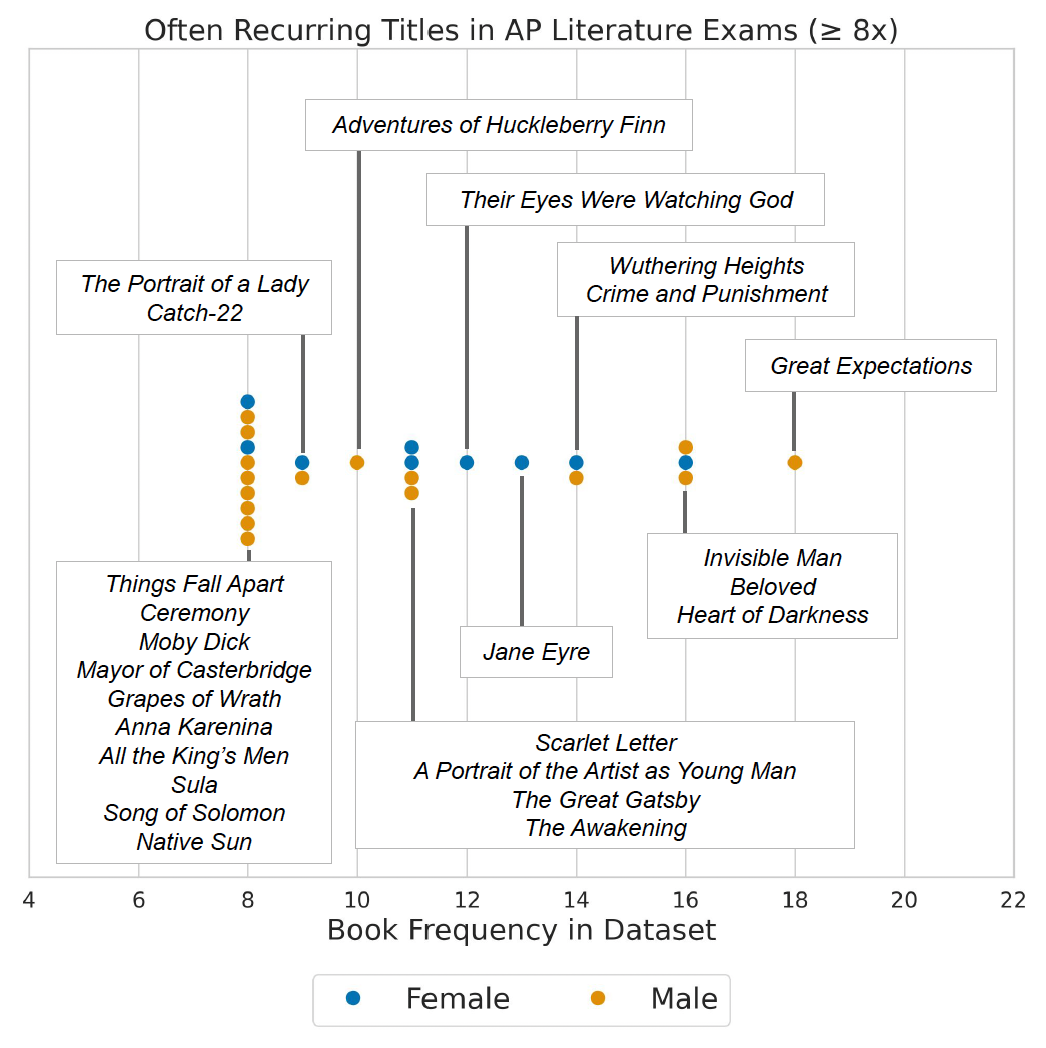 Other studies also consider many of the canonized titles in our AP Literature sample as cornerstones of ELA (Kumar; Stotsky et al.; Stallworth and Gibbons; Hadley and Toliver). For example, the top three titles listed by teachers in a 2006 study of 142 Alabama teachers included The Scarlet Letter, The Great Gatsby, and To Kill a Mockingbird (Stallworth et al. 482), and the first two titles both recur in 11 years of AP exams, and the last title in 7 years. As another example, a national survey of 488 secondary schools in 1989 surfaced Adventures of Huckleberry Finn as the most frequently taught ELA book (Applebee 4). Though published over thirty years ago, Applebee’s conclusion touches on enduring trends: “In all the settings which we examined, the lists of most frequently required books and authors were dominated by White males, with little change in overall balance from similar lists 25 or 80 years ago” (18). These prior snapshots of ELA in the US, combined with ours, suggest that the ELA canon may have been obdurate to societal shifts for over a century.