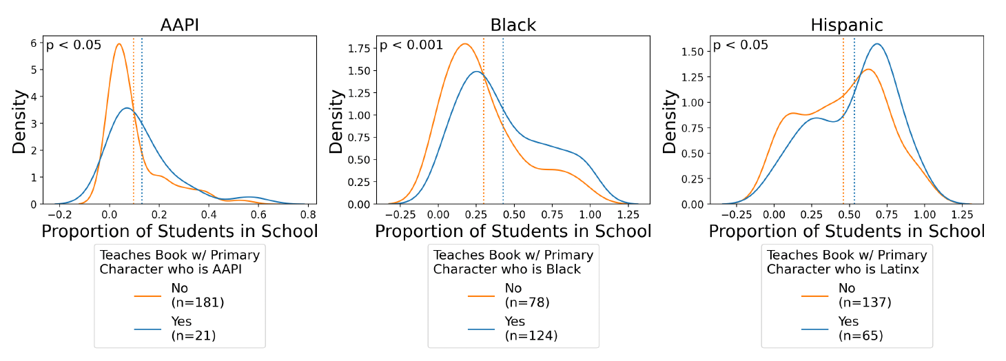 Though the AP exam is administered widely across the US, the books that AP Literature exams suggest may not reflect what all classrooms teach. The books listed by the teachers we surveyed provide a case study for how ELA materials in schools that serve racially and ethnically diverse student audiences can differ from the lists promoted by AP Literature. We hypothesized that some teacher-provided books may have been deliberately chosen to be culturally relevant to their student audiences. Indeed, we find that the racial/ethnic composition of books listed by each teacher corresponds to the composition of their students (Figure 6).18 In other words, teachers in schools with more AAPI, Black, and Hispanic students tend to teach more books with primary characters of similar racial/ethnic backgrounds.