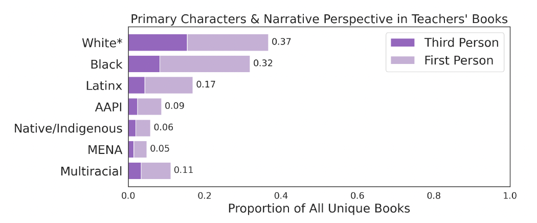 The majority of books in this dataset include main characters of color, and when present, they usually include the primary character (Figure 7). When it comes to character perspective, this teacher-provided dataset emphasizes first person narratives more so than third person ones, especially for primary characters of color (Figure 8). Broadly, the teacher-provided dataset includes main characters that are more evenly distributed across multiple racial/ethnic groups than AP Literature. Again, we did not find a statistically significant difference in the burstiness of primary characters of color and that of White primary characters. However, these teacher-provided books on average have less bursty, or more consistently present, primary characters than those in AP Literature. This finding applies to both primary characters of color (Mann-Whitney U-test, p<0.001) and White primary characters (Mann-Whitney U-test, p<0.01), and, when combined with this dataset’s first-person emphasis, suggests that teacher-provided books heavily focus on the actions and viewpoints of primary characters. These findings illustrate how the racial/ethnic composition of characters and their degree of presence in a set of ELA books can differ from AP. That is, though AP Literature books may not sufficiently represent minoritized student populations (§6), our teacher-provided dataset serves as a demonstration of how ELA teachers can adapt their curricula to create more mirrors for their students of color.