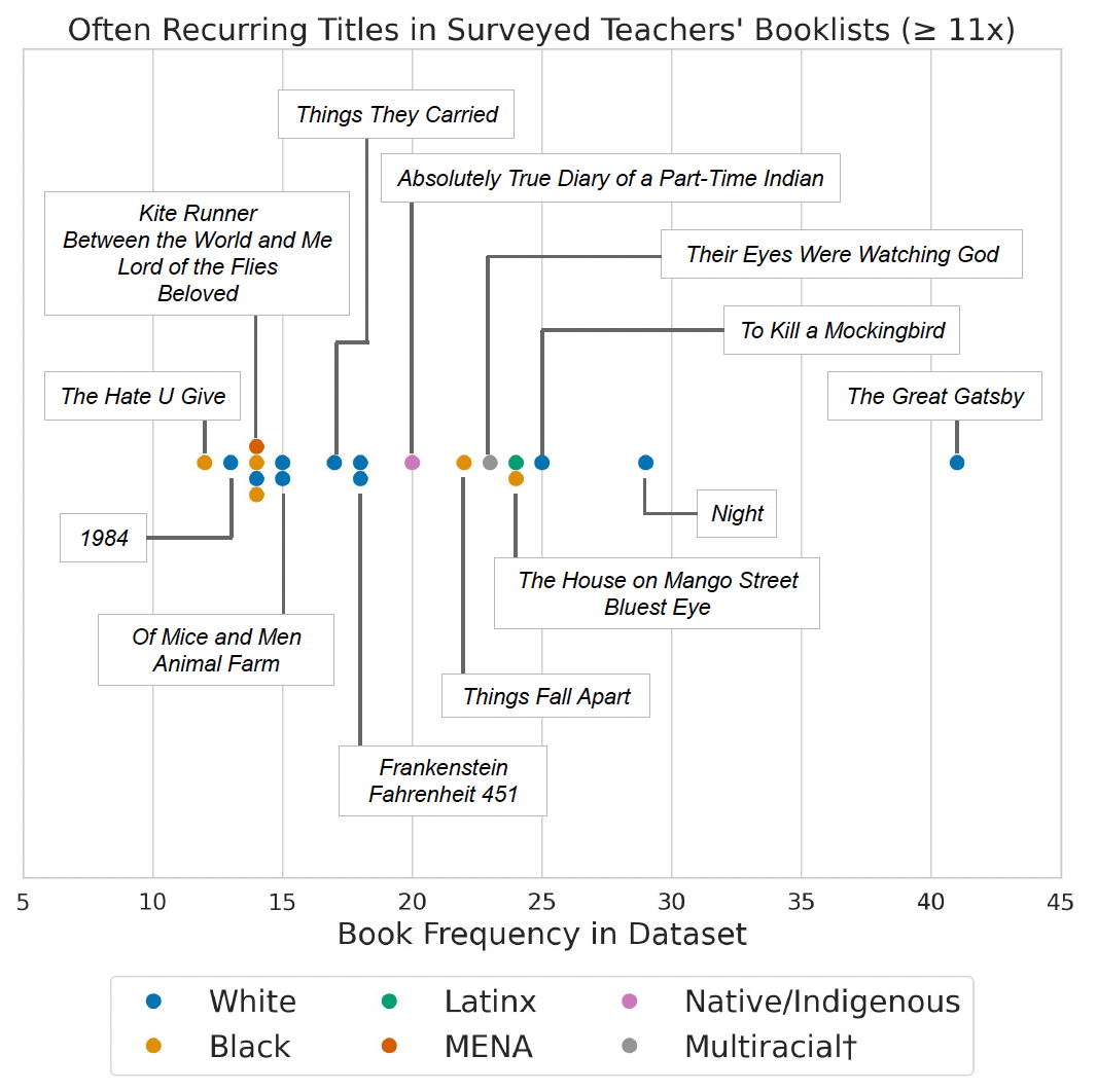 One limitation of our work is that we study books isolated from their classroom contexts. That is, future work should investigate how teachers interweave these books into discussions with students, and the psychological impact characters’ representation may have on students. It is impossible to make normative claims about what should be taught from book content alone, without consideration for how it is taught or socially situated. For example, there may be pedagogical value in comparing books that center racial inequality written by White authors (e.g. The Help, To Kill a Mockingbird) with those by authors of color (e.g. Beloved, The Hate U Give). As an illustration of how a classroom’s local context matters, we saw some evidence in our teacher-provided dataset that curriculum may be adapted to student audiences. Our work contributes to ongoing lines of research investigating the selection and implementation of ELA curriculum in the US and its impact on students, especially during a time of increasing school book bans (Alter; Hadley and Toliver). In a landscape where efforts to diversify school curricula are actively under attack (Pollock et al.), it is important to provide tools and information that can empower educators to make purposeful and meaningful decisions around not only what to teach, but how to teach. Generally, it takes more action than simply diversifying reading lists to build a more equitable, antiracist society (Melamed).