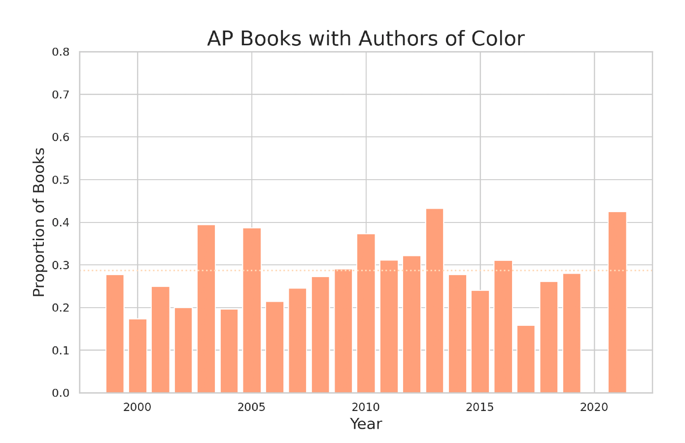 Though educators and researchers have reinforced the importance of culturally relevant, responsive, and sustaining pedagogy for decades (Ladson-Billings, Different Question; Department), school curricula often remain predominantly focused on White voices and perspectives (Lucy et al.; Hadley and Toliver; Levine). For example, Kumar’s 2022 study examined the racial demographics of authors whose books were included in ELA Guidebooks 2.0, which is a high school curriculum used across the United States. This study found that White authors wrote 27 of 29 (93.1%) titles included in the curriculum. This centering of Whiteness occurs early in primary school education (Rigell et al.), and also upstream in the US book publishing industry (Agosto et al.; So and Wezerek; McGrath 772). There is some evidence of improvement in the diversity of voices featured in ELA. So’s book Redlining Culture found an increase in Asian American, Latinx, or Native American authors between the 1979 and 2016 editions of the Norton Anthology of American Literature, which is a popular resource used in college-level coursework (145). As another example, Adukia et al. used computer vision to show that the presence of Black people in children’s award-winning books has increased over the past century, though characters in more influential books have lighter skin color on average. Our work builds upon these prior studies by surfacing two more views of what the teaching of literature encompasses or could encompass in the US, and additional insight into whether ELA has evolved over time. We not only spotlight a dominant, widely-adopted curriculum in the United States, as represented by AP’s suggested book lists, but also a case study centered on books taught to minoritized students, as represented by our teacher-provided lists.