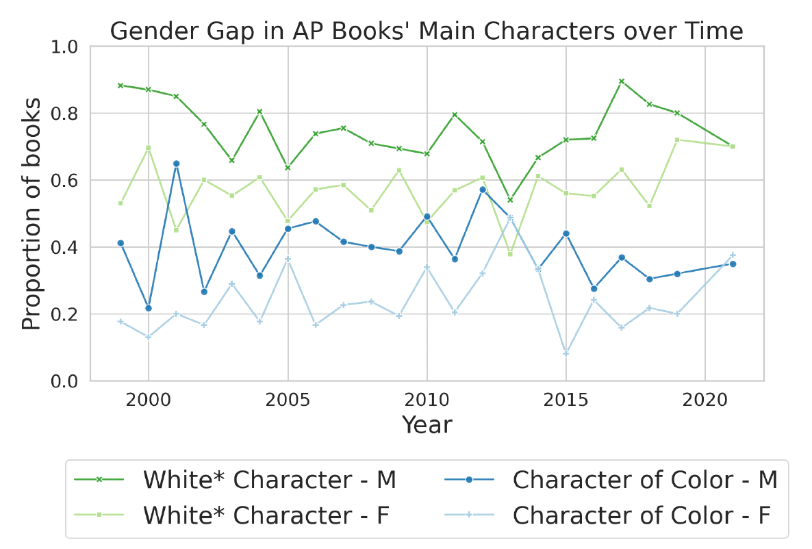 As discussed in §4.1, literary merit is a key motivator behind the selection and curation of AP reading lists. Literary merit is often indicated by the reception of literary prizes, which includes major awards such as the National Book Award or Pulitzer, and awards centered on media for children and young adults, such as the American Library Association’s Caldecott, Coretta Scott King, and Newbery awards. Grossman et al. showed that after the year 2000, literary prize winners became increasingly less White, with Black writers winning more literary prizes than any other race in 2017. Though the institutional contexts of these prizes differs from those in education, if AP Literature were to reflect cultural shifts in the attribution of literary merit, one may expect that book suggestions by AP Literature would become less White over time.